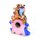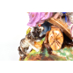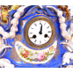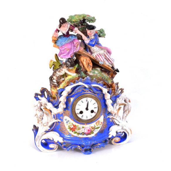JACOB PETIT STYLE - Relógio de mesa, com caixa em porcelana francesa Vieux Paris, século XIX. Em dois corpos: encimada por grupo escultórico: casal em cena galante, cão e folhagens. Base rebuscada em florões, festões, guirlandas pendentes em enlace. Pintura floral na reserva. Cor predominante azul. Mostrador em porcelana, com fios de cabelo, falta um ponteiro. Detalhes em dourado com desgastes. Com restauro. Máquina no estado, falta pêndulo, chave e campainha. Medidas: 43,5 x 34 x 14 cm.