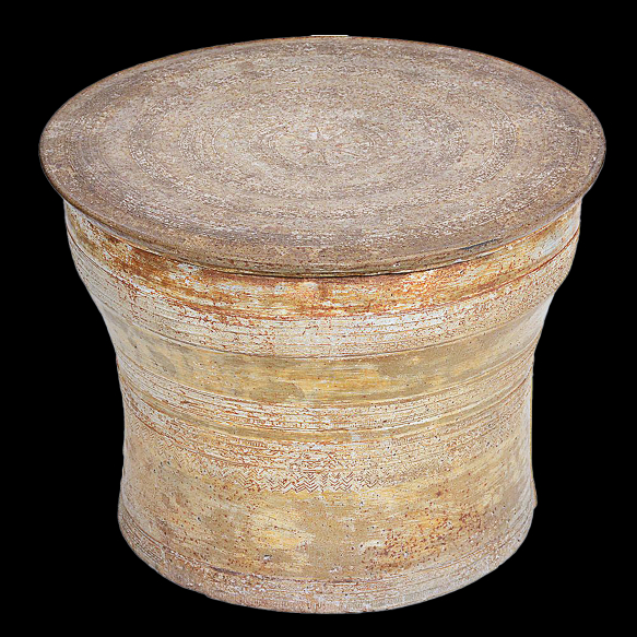 Grande tambor de bronze em homenagem aos Karen, também conhecido como "O Lago Mágico de Bronze". Representa a cultura Karen, que vivia da agricultura de corte e queima e dependia da chuva. Os tambores eram tocados para atrair as chuvas, pois as rãs coaxam antes da chuva e os sons graves do tambor as estimulavam a coaxar também. Assim, acreditava-se que o som do tambor era um chamado para a chuva. Esta peça fundida em cera perdida é ornamentada O centro do tímpano é decorado com um nítido relevo de 12 pontas em forma de "estrela de espuma". Das pontas da estrela sugem delicados circulos assemelhando-se a ondulações. Possui no corpo três faixas de ondas em relevo equidistantes Séc. XIX. Alt. 39 cm; Diâm. 50 cm