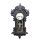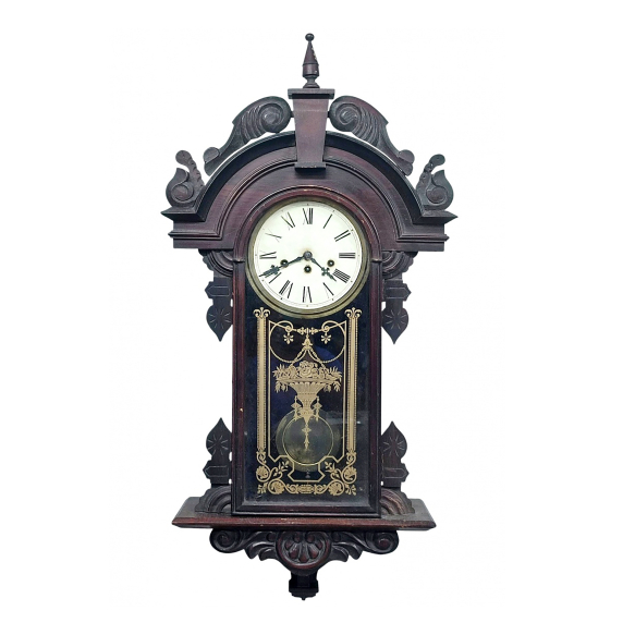 AMERICAN ANSONIA CLOCK COMPANY (1851-1929) Relógio carrilhão de grande porte americano de parede. Caixa em madeira entalhada em concha, folhagens e volutas. Máquina com chave e pêndulo, funcionando, porém necessita regulagens. Vidro original com ornamentos dourados.Apresenta desgastes causados pelo tempo. MEDIDAS: 1,00 x 44 x 20cm.