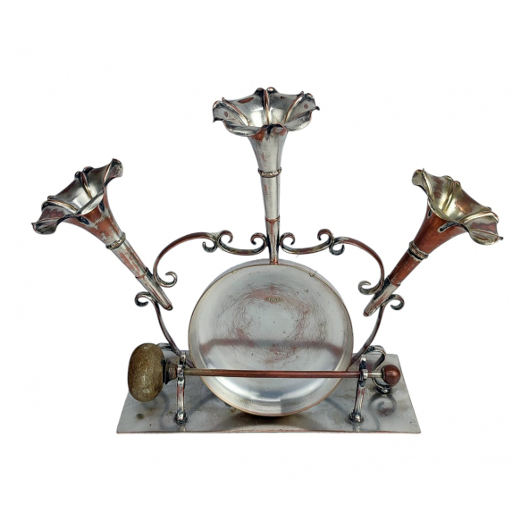J COLLYER & Co LTD BIRMINGHAM - Hockley Hill, since 1904* Floreiro de mesa com gongo em Silverplated inglês contrastado. Adornado por 3 recipientes na forma de tulipa. Apresenta desgastes no prateado. Med. 28x35x11cm.