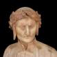 DANTE ALIGHIERI - ESCULTURA DE MÁRMORE DE CARRARA, ITÁLIA SÉCULO XIX. Livro na mão esquerda. Está usando cappuccio, um gorro trançado com abas nas orelhas. Acrescido uma coroa de louros por expertise em artes poéticas. Um símbolo tradicional emprestado da Grécia Antiga e até hoje usando em cerimônias de premiação de poetas laureados.A destra porta pena. Mão com restauro professional. MED: 59 X 15 X 19 CM PESO: 17,950 KG