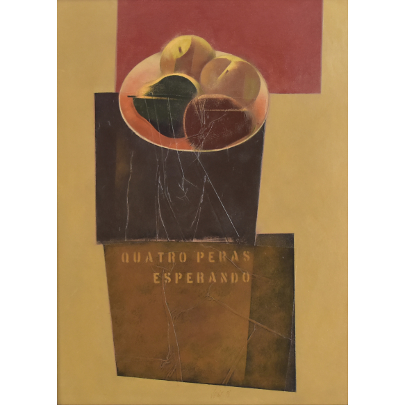 CARLOS SCLIAR (1920-2001) "QUATRO PERAS ESPERANDO", Ouro Preto (04/05/1978) VINIL E COLAGEM ENCERADO SOBRE TELA. MEDIDAS: S MOLDURA 75 X 55 CM / C MOLDURA 1,04 X 83 CM