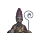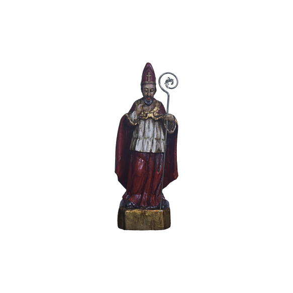 Imagem de SÃO NICOLAU, esculpida em madeira policromada. Minas Gerais, século XIX. Em trajes de bispo. Policromia refeita, aplicação de folhas de ouro. Consta báculo em metal prateado, com ponteira em voluta. MEDIDAS: 30 x 13 x 8 cm. DA DEVOÇÃO: nasceu no ano de 270 na cidade de Patras, Turquia, tendo sido eleito bispo de Mira e falecido no ano de 342 d.C. Myra, também na Turquia. Dito "Taumaturgo", também conhecido como São Nicolau de Bari, é o santo padroeiro da Rússia, Grécia e da Noruega. É o patrono dos guardas noturnos na Armênia e dos coroinhas na cidade de Bari, na Itália, onde estariam sepultados seus restos mortais.