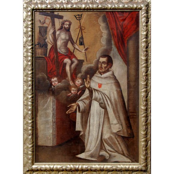 ESCOLA CATALÃ - Século XVIII - SAN RAMÓN NONATO ("NÃO- NATO") Óleo sobre tela Medidas: 147 x 102 cm.; na moldura: 170 x 124 cm. Obra com tratamento de conservação e restauro. ICONOGRAFIA: Em trajes de Mercedário, ele aguarda de joelhos a transmissão dos estigmas pelo Cristo, descido da cruz e rodeado dos instrumentos de martírio.