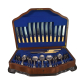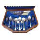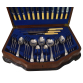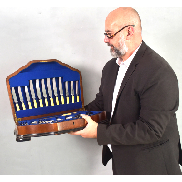 SIPELIA SHEFFIELD ENGLAND - EPNS- FAQUEIRO no estojo original, sem uso. Década de 1950. Completo: 6 colheres de sopa, 6 colheres de sobremesa, 6 colheres de chá, 6 garfos, 6 garfos de sobremesa, 6 facas, 6 facas de sobremesa. SERVIÇO: 2 colheres grandes, 1 faca de corte, 1 garfo distrinchador e 1 amolador. Sem uso, forração interna em perfeito estado. Cabos em Marfinite, peças em Silverplated, sem perdas, sem oxidação. Já não consta a chave. TOTAL: 47 PEÇAS.