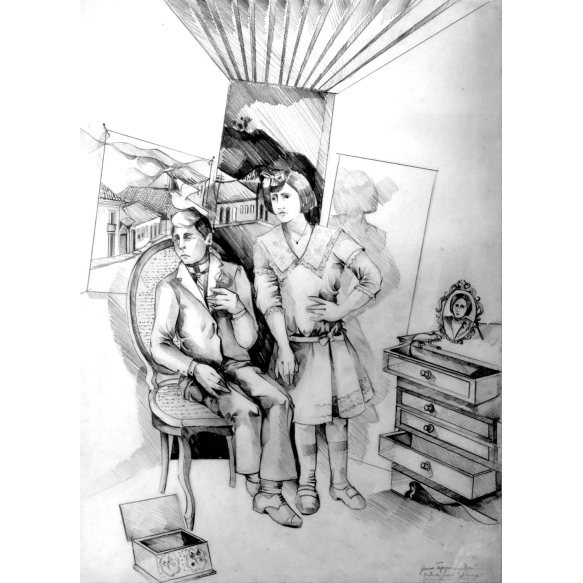 Ilustração para o livro “A mesa de Carlos Drummond de Andrade” de Ozório Couto em página inteira.