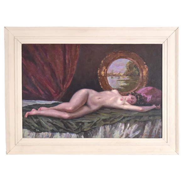 Sergio Giannini, O.S.T., `Nú feminino`, 1990. A.D.C.I.D. Medidas: 50 x 73 cm. Emoldurado: 64,5 x 88 cm. Sobrinho do pintor Aurélio D'Alincourt com quem iniciou seus estudos.