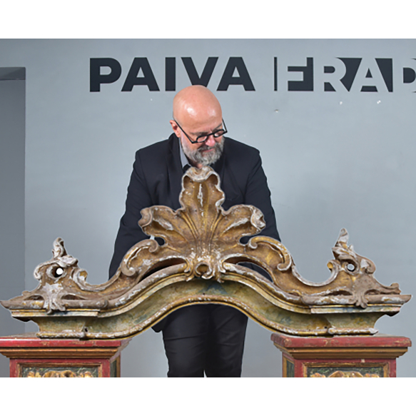 SANEFA- FRAGMENTO BARROCO - BRASIL, SÉCULO XVIII. ELEMENTO ARQUITETÔNICO DE INTERIOR DE CAPELA, FUNÇÃO DE SOBREPOR E DAR ACABAMENTO AS JANELAS. TALHA EM MONOBLOCO DE MADEIRA, HAVENDO EMENDA SOMENTE NA METADE DO PENACHO CENTRAL CONCHEADO, TRIPARTIDO. VOLUTAS, VAZADOS, FAIXA MARMORIZADA E FAISCADA, NO TON AZUL.PERDAS NA CARNAÇÃO E NA DOURAÇÃO. MED: 1,80 X 46 X 33 CM. PESO: 23.350 KG.