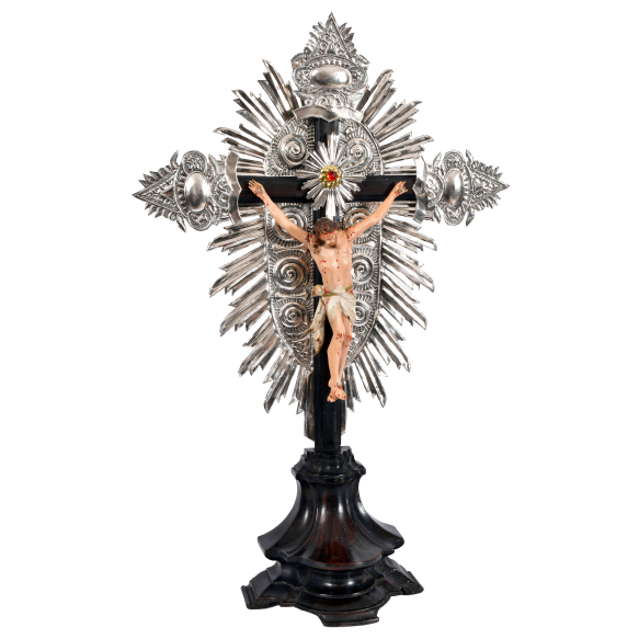 Crucifixo em jacarandá, Portugal século XIX. Senhor do Bomfim, em cedro entalhado, carnado, policromia orgânica e mineral, original. Base entalhada em Escócia, triplóide e em dois estágios. Exuberante conjunto em metal prateado, rebatido e cinzelado pelo anverso: 4 raias de formato ovalado, com nimbos concêntricos, 3 ponteiras de terminação triangular, 3 cravos, resplendor com metal dourado incrustado com pedraria. Medidas crucifixo: 52 x 19 x 10 cm. Medidas Cristo: 23 x 16,5 cm.