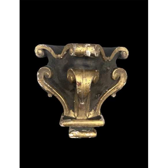 Base de crucifixo barroco. Madeira de jacarandá entalhado em volutas, resquícios de carnação, policromia e folhas de ouro. Minas Gerais, séc. XVIII. Medidas: 25,5 x 22 x 13 cm.
