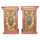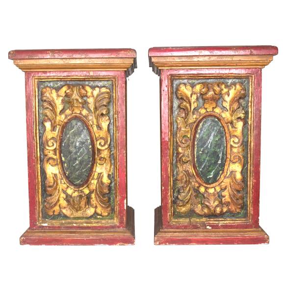 PAR DE COLUNAS, PILASTRAS EM MADEIRA. BRASIL SÉCULO XVIII. EMOLDURADAS, ALMOFADADAS, PATINADAS, MARMORIZADAS E FAISCADAS NO TOM VERDE ESMERALDA, CONTRAPONDO A DOURAÇÃO E AO ENCARNADO. A TÁBUA DO FRONTÃO EXIBE TALHA EM BAIXO RELEVO DE CARTELA OVALADA, RODEADA DE FORMAS RECURVAS E SIMÉTRICAS, FLORÕES E FOLHAS DE ACANTUS. MEDIDAS: 68 X 43 X 43 CM PESO: 12,150Kg (cada)