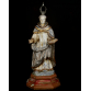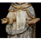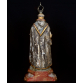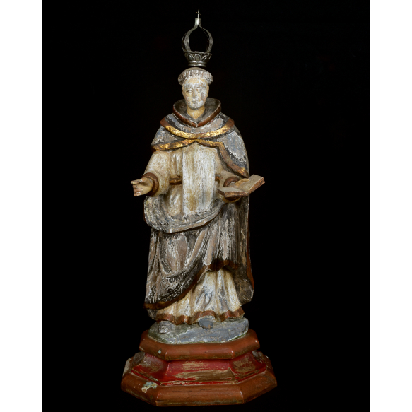 SÃO DOMINGOS DE GUSMÃO - MINAS GERAIS, SÉCULO XIX. Fatura popular, hábito Dominicano. Madeira entalhada, resquício de policromia. O LIVRO NA MÃO: Na tradição popular espanhola, o Doutor da Igreja de São e seu opositor Albigense disputou com ele jogando seus livros no fogo. O livro de São Domingos teria, miraculosamente, pulado do fogo. Sobre base oitavada e encarnada. Acompanha coroa em prata. MED: 59 X 25 X 13 CM