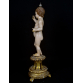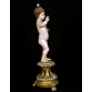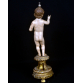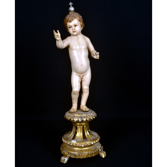 MENINO DEUS- A. A. ESTRELLA, oficina do Porto, Portugal, século XIX. Boca entreaberta com dentes, olhos de vidro. Base triplóide em patas de leão, galeria vazada, perolados, folhas de Acantus e douração original, no estado. Consta de atributo em prata no formato de Orbe encimado por cruz. MED: 40 X 14 X 7 CM. "Casa Estrella – Officinas d’Esculptura e Talha religiosa", fundada em 1874 por Antonio d’ Almeida Estrella, na cidade do Porto, Portugal. A Casa Estrella destacou-se como uma das mais importantes oficinas de escultura e talha religiosa de Portugal, reconhecida pela excelência em trabalhos de madeira, marfim e massa. Recebeu importantes prêmios nas Exposições Industriais Portuguesas de 1887 e 1897, consolidando sua reputação como referência na produção de arte sacra de alta qualidade. No início do século XX, a Casa Estrella ampliou sua influência com a distribuição gratuita de um catálogo comercial ilustrado, contendo 143 gravuras, que apresentava seu vasto portfólio de obras. Este esforço publicitário demonstra a sofisticação e visão empresarial da oficina, que atendeu às demandas do mercado religioso, fornecendo peças para igrejas, conventos e colecionadores particulares.