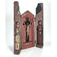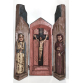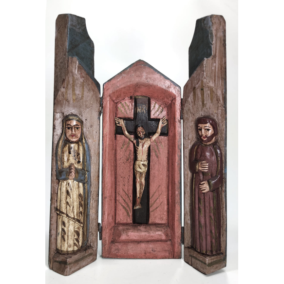 "Oratório de Viagem" dito de algibeira ou "oratório bala". Fina artesania pernambucana. Tríptico formado pelas figuras de Jesus, Maria e José, talhados na madeira e policromados. Medidas: 23 x 8 x 4 cm. Aberto: 23 x 18 x 4 cm.