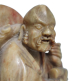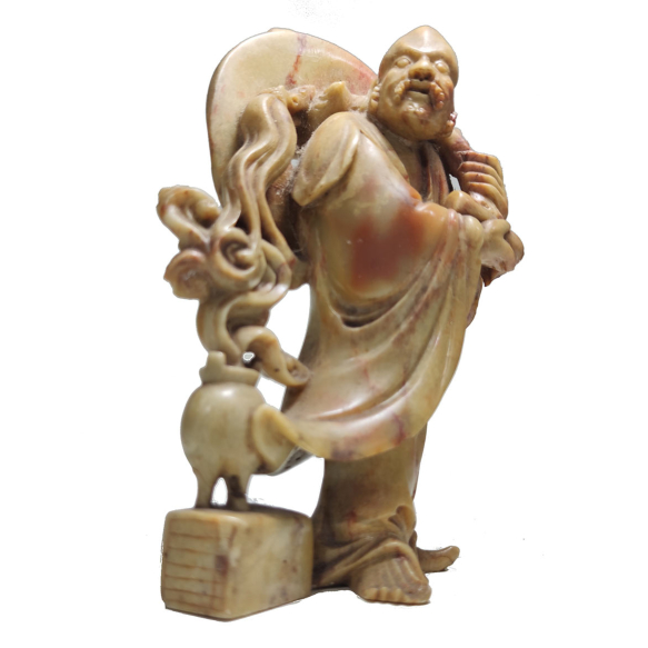 LIE TIE GUAI Escultura oriental em pedra dura, figurando imortal. Alguns bicados. CHINA SÉCULO XIX. Medidas: 16,5 x 11 x 5,5 cm. TÉCNICA: Chinese Hardstone Carvings- O entalhe em pedra é uma das artes mais antigas da China, e seu início remonta à antiguidade. Embora o jade, o mineral nefrita, fosse tido em alta estima, todas as pedras que pudessem alcançar um brilho após o polimento, seja ágata, turquesa, malaquita, calcedônia, quartzo, jaspe ou lápis-lazúli, também eram apreciadas. A escultura em pedra sofreu uma florescência durante a dinastia Qing (1644–1911).