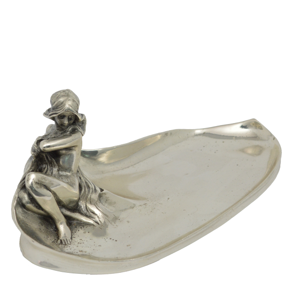 Porta cartões ART DECO c. 1930 em pewter com escultura de Ninfa das águas ou Naiade, nu feminino de cabelos longos. Banho de prata refeito, em perfeito estado. Medidas: 9,5 x 25 x 16,5 cm.