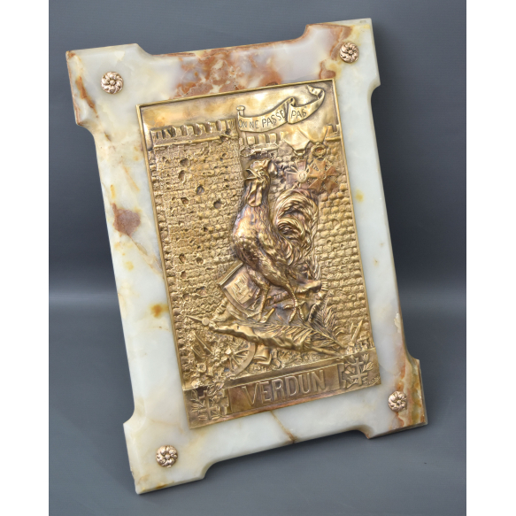 MEMORABILIA DA PRIMEIRA GUERRA MUNDIAL - VITÓRIA NA BATALHA DE VERDUN - 1916. "EN NE PASSE PAS" (Eles não passarão!)- Slogan onde a França, representada pelo GALO* pisando sobre armas, um pavilhão, roda quebrada, entre outros símbolos, comendas e muralha intacta ao fundo. A palavra VERDUN é ladeada nos flancos pela figura heráldica da CRUZ DE LORENA. (Croix de Lorraine). Medidas: 40,5 x 30 x 26 cm.