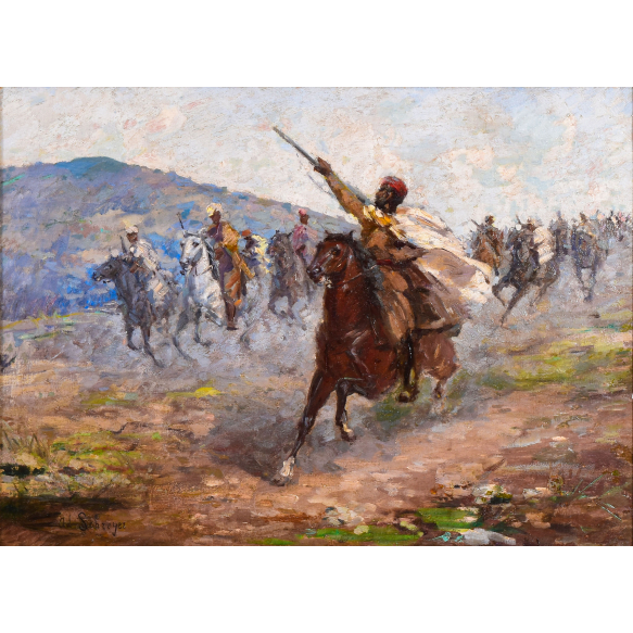 EspañolADOLF SCHREYER CLICK AQUI E ASSISTA O VIDEO (Frankfurt am Main, 9 de julho de 1828 - Kronberg im Taunus, 29 de julho de 1899), "Cavalaria de mouros" Óleo sobre tela Assinado no canto inferior esquerdo Medidas: 73,5 x 100,3 cm. Com moldura: 96,5 x 123 cm.Christian Adolf Schreyer, nasceu em 9 de maio de 1828, em Frankfurt am Main, na Alemanha, e foi um dos mais notáveis pintores orientalistas do século XIX, e suas cenas equinas lhe renderam aclamação em toda a Europa, ganhando inúmeros prêmios e honrarias internacionais. As pinturas de Schreyer são conhecidas por sua energia dinâmica e uso habilidoso de luz e sombra. Ele retratou cenas de batalhas com um realismo impressionante, capturando o movimento dos cavalos e a emoção da ação marcada por uma atenção meticulosa aos detalhes, ganhando reconhecimento internacional como um dos principais pintores de batalhas do século XIX. Schreyer começou sua carreira como aprendiz de um comerciante de vinhos e, logo abandonou e iniciou seus estudos na Alemanha, como pintor militar e paisagista no Städel Institute em Frankfurt, depois continuou em Stuttgart, Munique e Düsseldorf, onde suas aulas incluíam equitação e anatomia equina. No início de sua carreira, tendia a retratar o frenesi da batalha, mas à medida que amadureceu suas figuras tornaram-se mais solitárias e estudadas, viajou pela primeira vez para a Rússia e o Cáucaso como um artista-repórter, designado para cobrir a Guerra da Crimeia, os costumes e tradições locais. No final da década de 1840, foi chamado para viajar com o príncipe Thurn e seu regimento pela Hungria e sul da Rússia e, em 1854, durante a Guerra da Criméia, ele seguiu o regimento no campo de batalha como um artista de guerra oficial. No início da década de 1860 Schreyer viajou pelo norte da África, Egito e Síria, onde mergulhou completamente na vida beduína, uma rica fonte de imagens para suas pinturas. Os cavaleiros em sua obra, árabes ou cossacos, foram frequentemente retratados lutando, numa paisagem ligeiramente selvagem e inóspita. Em 1862, mudou para Paris, onde se firmou no cenário artístico local, com a eclosão da Guerra Franco-Prussiana, Schreyer voltou para sua Alemanha e devido à sua carreira de sucesso, foi nomeado pintor da corte do Grão-Duque de Mecklenburg e membro das academias de Amsterdam e Rotterdam pintando ativamente até sua morte em 1899. Durante sua carreira, Schreyer viajou extensivamente pela Europa onde participou de várias exposições importantes e recebeu inúmeras honras e prêmios e, pelo Oriente Médio, visitando países como Turquia, Egito e Argélia, em 1870, foi morar em Kronberg im Taunus perto de Frankfurt, onde morreu. Hoje, as obras de Schreyer podem ser encontradas em museus em todo o mundo: Museu de Belas Artes de Leipzig, Galeria de Arte de Nova Gales do Sul, Sydney, Austrália, Museu do Hermitage, São Petersburgo, Rússia. Staatliches Museum Schwerin, Mensdorff-Pouilly Raven Gallery, Berlim. Museo Storico dell'Arma dei Carabinieri Musée du Luxembourg. Metropolitan Museum of Art em Nova Iorque E coleções particular como: Família Rockefeller, Família Vanderbilt, John Jacob Astor, William Backhouse Astor, August Belmont, William Walters. Christian Adolf Schreyer faleceu em 29 de julho de 1899, em Kronberg im Taunus, também na Alemanha. Alexandre Paiva Frade