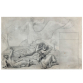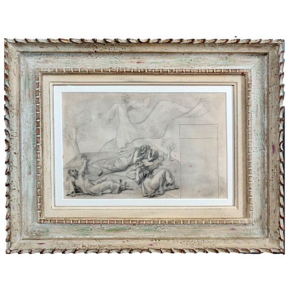 EspañolPORTINARI - Candido (Brodowski, SP 1903 — Rio de Janeiro, 1962) CLICK AQUI E ASSISTA O VIDEO 30,5X46,5 cm./ 58,5x74,5 cm. Desenho a grafite. "A transfiguração", 1944 2168 FCO1022 volume 3, página 45. Reproduzido no catálogo raisonné do Projeto Portinari Divina Pastora” [FCO 1013] TEMAS: Religioso:Cenas Religiosas:Transfiguração Religioso:Jesus Figura Humana:Grupo:Homens DESCRIÇÃO: Composição em preto e branco. Linhas definindo contornos e sombreados definindo volume. Três figuras deitadas sobre morro e Jesus caminhando na direção dessas figuras. À direita da composição, espaço em forma de retângulo em branco, correspondente à porta da parede da sala de jantar onde seria realizada a pintura mural. No primeiro plano à esquerda, homem deitado no chão, usando longa túnica de mangas compridas. Ele está na horizontal com o tronco levantado apoiando-se no braço direito, braço esquerdo levantado, cabeça voltada para o alto olhando na direção de Jesus que está mais ao fundo. Mais para a direita, outro homem, deitado, 3/4 voltado para a direita, usa longa túnica de mangas compridas, tem as costas apoiadas sobre uma pedra, pernas dobradas, braço direito dobrado apoiado no peito e braço esquerdo esticado para frente, cabeça voltada para o alto na direção de Jesus que está mais ao fundo. No segundo plano, numa parte mais elevada do morro, ao centro, homem deitado na horizontal, com a cabeça à direita e para frente. No terceiro plano, ao centro, em parte mais elevada do morro, Jesus caminhando de frente com os braços aberto, usando túnica com longa cauda esvoaçante.