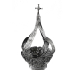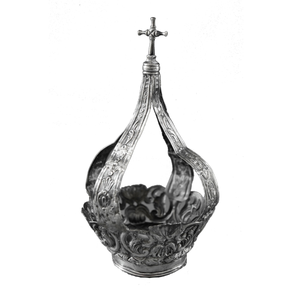 ARTE SACRA - Coroa em PRATA de lei. Repuxada, batida e cinzelada. Estilo D. João V- Barroco em conchas, rocalhas e folhas de Acanto.*ROMPITURA EM UMA DAS ALÇAS, necessita solda. Encimada por Cru z. Brasil, Século XVIII PESO: 61 g. MEDIDAS: 15 x 9 x 9 cm. Base: 4,5 cm.
