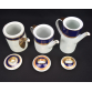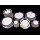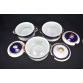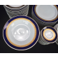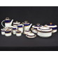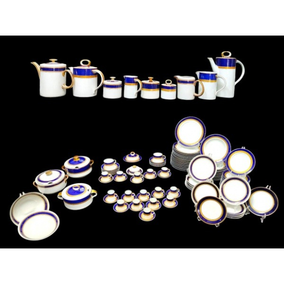 Parte de aparelho de serviço de jantar, chá e café em porcelana nacional Steatita e Schmidt com faixa na cor azul cobalto e frisos dourado. A saber: 3 bules (2 para chá e 1 para café); 2 leiteiras; 1cremeira; 3 açucareiros; 2 manteigueira; 3 sopeiras; 2 xícaras para chá com 11 pires; 15 xícaras para café com 17 pires; 17 pratos rasos; 12 pratos fundos e 27 pratos para sobremesa. ATENÇÃO: Este lote é composto por 2 marcas diferentes, portanto, há diferenças na decoração das peças.