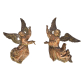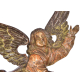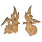 Par de Anjos de presépio, Brasil, século XIX. Madeira de cedro talhada, carnada e policromada. Há diferença nas feições, nas altura dos cabelos e no panejamento de drapeados movimentados. Asas abertas, sendo uma de encaixe proporcionando angulosidade e volume, uso parietal. Marcas de ataque por insetos xilófagos ocorrido no passado e já controlado. Medidas: 40,5 x 23 x 20,5 cm. e 43,5 x 21 x 17,5 cm.