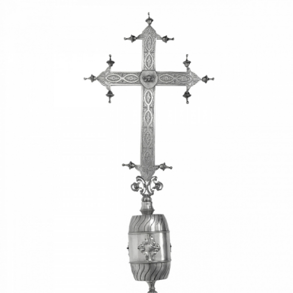 CRUZ PROCESSIONAL - Brasil, século XIX.Crucifixo de procissão em metal repuxado, burilado, cinzelado e espessurado a prata. Bojo ornado com duas faixas de linhas sinuosas centralizando faixa lisa com aplicação de folhas estilizadas em relevos, encimado por cruz com terminação em bilros e burilados de elementos vegetalistas. Vara de seis segmentos decorada em seu todo com espiralados: 263 cm de comprimento total. Ex-coleção José Celestino Monteiro de Barros Bourroul e Cárbia Sabatel de Bourroul, membro da Academia Paulista de História. DA TRADIÇÃO: A cruz processional é geralmente montada na ponta de uma haste de prata que a eleva o suficiente para que, envolta em nuvens de incenso, os fiéis a vejam, entre dois ciriais, na abertura das procissões. Também denomina-se cruz alçada. A peça aqui reproduzida contém todas as características de obra do século XVII. FONTE: Livro “O Ofício da Prata no Brasil.” Humberto M. Franceschi, Rio de Janeiro, 1988. Com ilustrações da prataria brasileira de diversas coleções como o Museu Imperial de Petrópolis, Museu Histórico Nacional, Palácio do Grão-Pará e coleções particulares.