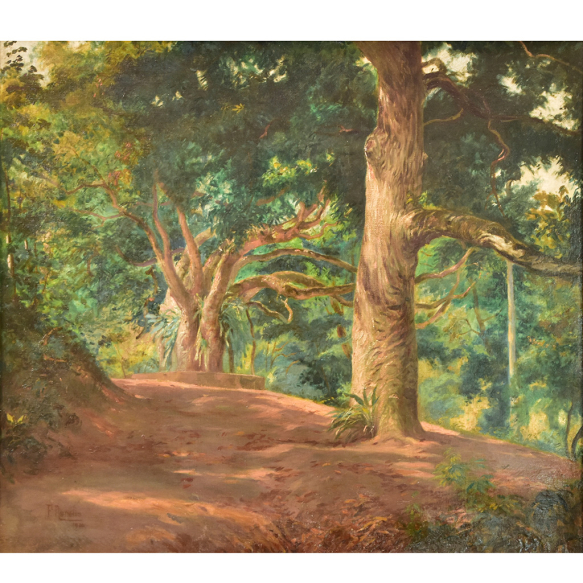 Francisco Aurélio de Figueiredo e Mello (Areia, Paraíba, 3 de agosto de 1854 — Rio de Janeiro, 9 de abril de 1916) CLICK AQUI E ASSISTA O VIDEO Floresta da Tijuca Óleo sobre Tela Assinado no c.i.e. Medidas: 74 x 82 cm. Emoldurado: 94 x 103 cm. Francisco Aurélio de Figueiredo, pintor da "Era Romântica" brasileira, ficou conhecido por obras emblemáticas como "Martírio de Tiradentes" e "Último Baile da Ilha Fiscal". Sua carreira foi marcada por estudos na Europa, participações em exposições oficiais e colaborações em jornais. Aurélio contribuiu para a construção da imagem nacionalista e civilizada do Brasil durante o Segundo Reinado, através de suas pinturas históricas e retratos. Ex-coleção deputado Sergio Nader - RJ