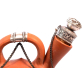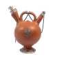 CERÂMICA DAS CALDAS DA RAINHA, PORTUGAL. c. 1920. Moringa ou "Moringue" em terracota, são de prata repuxada e cinzelada: as tampas, o anel da alça, a orla da base em perolados e folhas de parreira. Sobre uma das faces do bojo, o monograma M.F. entrelaçado em caligrafia gótica. Constam mossas nas tampas. Medidas: 28 x 23 x 15,5 cm.