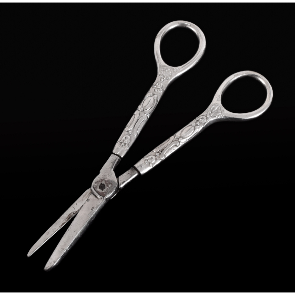 Tesoura para cortar uvas com cabo de PRATA PORTUGUESA, contraste da cidade do PORTO, CABEÇA DE ÁGUIA*, teor 833. marca do prateiro já ilegível. Período: (1938-1984) segundo oLivro da Imprensa Nacional, Casa da Moeda, página 13. Lâmina de aço. Medidas: 14,5 x 5 cm.