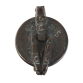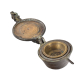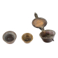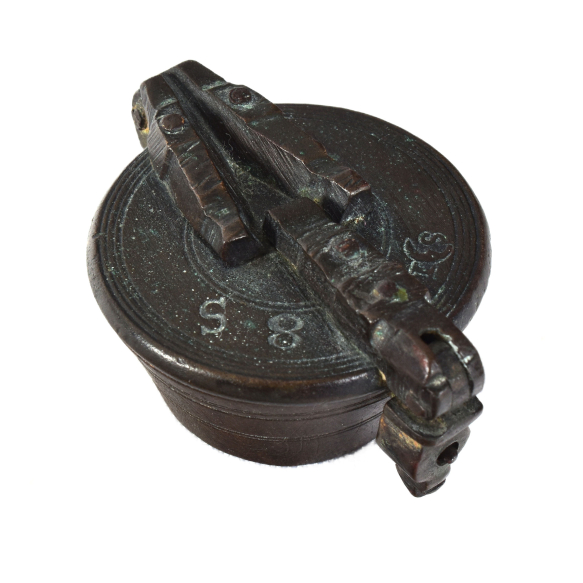 "Custódia" ou "cadinho quinteiro". Fundido em bronze, para medir ouro em pó. Minas Gerais, séculos XVIII/XIX. Compostas por estojos com tampas e abas decoradas, e pesos de diversos diâmetros, encaixados uns nos outros, utilizados nas transações com ouro em pó. O cálculo baseia-se na onça, antiga unidade de peso, equivalente a 28,691 gramas. Normalmente a caixa pesava duas onças e continha cinco medidas, para uma onça, meia onça, um quarto de onça, uma oitava de onça e um dezesseis avos de onça.
