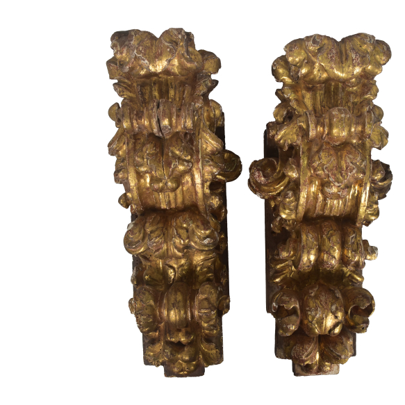PAR DE FRAGMENTOS RETABULARES, TALHA BARROCA- MINAS GERAIS SÉCULO XVIII. MADEIRA DE PINHO DE RIGA* CARNAÇÃO E OURO. LUXURIANTE APELO VEGETALISTA EM CURVAS, CONTRACURVAS E ESPIRALADOS. NO ESTADO: Apresenta perdas e marcas de antigo ataque de insetos xilófagos, já extinto. MED: 54 X 18 X 32 CM. PESO:11.150 KG. A madeira de Pinho de Riga não é endógena (nativa) do Brasil. Ela é originária das florestas frias da Europa Oriental, especialmente da região do Báltico (Letônia, Lituânia e Rússia). Origem e Presença no Brasil: Importação: A madeira chegou ao Brasil durante o período colonial, nos séculos passados, sendo trazida em navios europeus, muitas vezes utilizada como lastro.