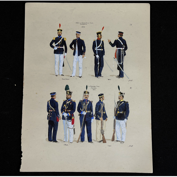 EspañolJOSÉ WASTH RODRIGUES (São Paulo, 1891 - Rio de Janeiro, 1957) 32x23 cm. Aquareladas à mão ESTAMPA N. 79 — CORPOS E COMPANHIAS FIXOS: Cavalaria - 1852: Capitão em grande uniforme (Corpo de Minas Geraes); Alferes em grande uniforme (Corpo de Minas Geraes; Soldado em grande uniforme (Corpo da Bahia): Sargento em pequeno uniforme (Corpo da Bahia). ESTAMPA N. 80 — CORPOS E COMPANHIAS FIXOS: Caçadores — 1852: Alferes, pequeno uniforme (S. Paulo) ; Tenente-Coronel, grande uniforme (Idem) ; Soldado, grande uniforme (Idem) ; Soldado, pequeno uniforme (Ceará) ; Soldado, grande uniforme (Idem). Impresso em Paris, ano 1922:A. FERROUD. - F. FERROUD, Succ. 127, Boulevard Saint German, 127. Um exaustivo e valoroso trabalho consagrado como um dos maiores clássicos relacionados ao tema. Raríssima obra da qual foram editadas apenas 500 unidades e aquareladas à mão. A Coleção Iconográfica Uniformes Militares compõe o Arquivo Histórico do Museu Histórico Nacional. O pintor José Wasth Rodrigues foi um grande historiador e estudioso da arquitetura colonial no Brasil. Seus estudos do início do século 20 foram incorporados ao livro “Documentário Arquitetônico”, no qual o autor se dedica à complexidade do patrimônio nacional. Publicado pela primeira vez em 1940, o estudo reúne uma série de elementos que podem ser vistos também nas obras do acervo do Museu do Ipiranga.
