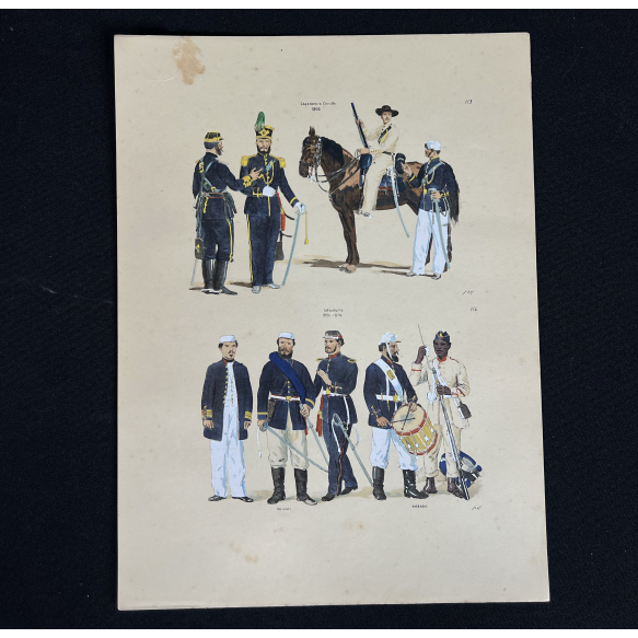 EspañolJOSÉ WASTH RODRIGUES (São Paulo, 1891 - Rio de Janeiro, 1957) 32x23 cm. Aquareladas à mão ESTAMPA N. 113 —CAÇADORES A CAVALLO — 1866: Coronel, segundo uniforme; Capitão, primeiro; Praça de pret, segundo; Idem, primeiro. ESTAMPA N. 114 —INFANTARIA — 1866 a 1871: Coronel, pequeno uniforme; Capitão, idem; Alferes, idem; Tambor, idem; Anspessada, idem. Impresso em Paris, ano 1922:A. FERROUD. - F. FERROUD, Succ. 127, Boulevard Saint German, 127. Um exaustivo e valoroso trabalho consagrado como um dos maiores clássicos relacionados ao tema. Raríssima obra da qual foram editadas apenas 500 unidades e aquareladas à mão. A Coleção Iconográfica Uniformes Militares compõe o Arquivo Histórico do Museu Histórico Nacional. O pintor José Wasth Rodrigues foi um grande historiador e estudioso da arquitetura colonial no Brasil. Seus estudos do início do século 20 foram incorporados ao livro “Documentário Arquitetônico”, no qual o autor se dedica à complexidade do patrimônio nacional. Publicado pela primeira vez em 1940, o estudo reúne uma série de elementos que podem ser vistos também nas obras do acervo do Museu do Ipiranga.