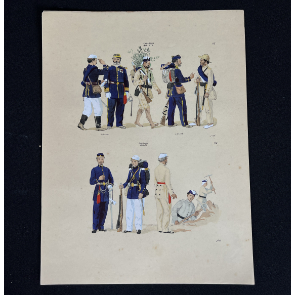 EspañolJOSÉ WASTH RODRIGUES (São Paulo, 1891 - Rio de Janeiro, 1957) 32x23 cm. Aquareladas à mão ESTAMPA N. 115 — CAÇADORES A PE—1866 a 1870: Alferes, uniforme de meia marcha; Coronel, pequeno uniforme; Soldado, idem; Idem. ESTAMPA N. 116 - ENGENHARIA — 1865 a 1871: Alferes, pequeno uniforme (1866); Soldado, idem, mesma data; Sargento, idem, mesma data; Soldado, idem (1871); Soldado, idem, mesma data. Impresso em Paris, ano 1922:A. FERROUD. - F. FERROUD, Succ. 127, Boulevard Saint German, 127. Um exaustivo e valoroso trabalho consagrado como um dos maiores clássicos relacionados ao tema. Raríssima obra da qual foram editadas apenas 500 unidades e aquareladas à mão. A Coleção Iconográfica Uniformes Militares compõe o Arquivo Histórico do Museu Histórico Nacional. O pintor José Wasth Rodrigues foi um grande historiador e estudioso da arquitetura colonial no Brasil. Seus estudos do início do século 20 foram incorporados ao livro “Documentário Arquitetônico”, no qual o autor se dedica à complexidade do patrimônio nacional. Publicado pela primeira vez em 1940, o estudo reúne uma série de elementos que podem ser vistos também nas obras do acervo do Museu do Ipiranga.