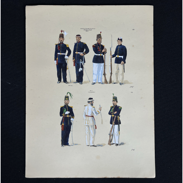 EspañolJOSÉ WASTH RODRIGUES (São Paulo, 1891 - Rio de Janeiro, 1957) 32x23 cm. Aquareladas à mão ESTAMPA N. 121 — INFANTARIA PESADA - 1871: a) Alferes, grande uniforme; b) Idem, pequeno; c) Soldado, grande; d) Idem, pequeno. ESTAMPA N. 122 — INFANTARIA LIGEIRA: Caçadores — 1871: a) Tenente em grande gala; b) Tenente-Coronel, farda de verão; c) Soldado, grande gala; Impresso em Paris, ano 1922:A. FERROUD. - F. FERROUD, Succ. 127, Boulevard Saint German, 127. Um exaustivo e valoroso trabalho consagrado como um dos maiores clássicos relacionados ao tema. Raríssima obra da qual foram editadas apenas 500 unidades e aquareladas à mão. A Coleção Iconográfica Uniformes Militares compõe o Arquivo Histórico do Museu Histórico Nacional. O pintor José Wasth Rodrigues foi um grande historiador e estudioso da arquitetura colonial no Brasil. Seus estudos do início do século 20 foram incorporados ao livro “Documentário Arquitetônico”, no qual o autor se dedica à complexidade do patrimônio nacional. Publicado pela primeira vez em 1940, o estudo reúne uma série de elementos que podem ser vistos também nas obras do acervo do Museu do Ipiranga.