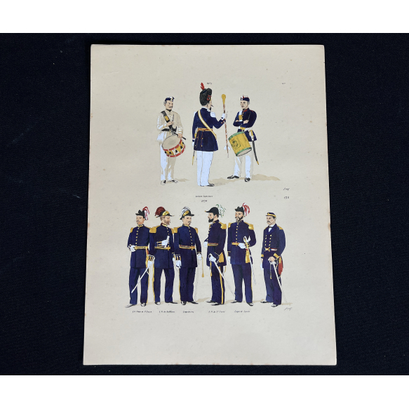EspañolJOSÉ WASTH RODRIGUES (São Paulo, 1891 - Rio de Janeiro, 1957) 32x23 cm. Aquareladas à mão ESTAMPA N. 127 — 1873: Tambor de Caçadores, pequeno uniforme; Tambor Mór de Infantaria, grande gala; Tambor de Infantaria, pequeno uniforme. ESTAMPA N. 128 — 1874: Capitão do Estado Maior de 1* Classe, grande uniforme; Idem do Estado Maior de Artilharia, mesmo uniforme; Idem de Engenheiros, mesmo uniforme; Idem do Estado Maior de 2* Classe, mesmo uniforme; Idem do Corpo de Saude (Medico), mesmo uniforme; Tenente-Coronel do Estado Maior de 1" Classe, segundo uniforme. Impresso em Paris, ano 1922:A. FERROUD. - F. FERROUD, Succ. 127, Boulevard Saint German, 127. Um exaustivo e valoroso trabalho consagrado como um dos maiores clássicos relacionados ao tema. Raríssima obra da qual foram editadas apenas 500 unidades e aquareladas à mão. A Coleção Iconográfica Uniformes Militares compõe o Arquivo Histórico do Museu Histórico Nacional. O pintor José Wasth Rodrigues foi um grande historiador e estudioso da arquitetura colonial no Brasil. Seus estudos do início do século 20 foram incorporados ao livro “Documentário Arquitetônico”, no qual o autor se dedica à complexidade do patrimônio nacional. Publicado pela primeira vez em 1940, o estudo reúne uma série de elementos que podem ser vistos também nas obras do acervo do Museu do Ipiranga.
