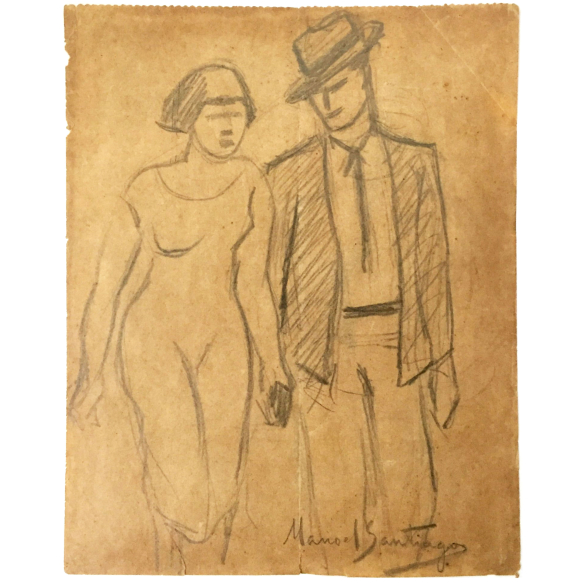 EspañolMANOEL SANTIAGO CLICK AQUI E ASSISTA O VIDEO (Manoel Colafante Caledônio de Assumpção Santiago, Manaus AM 1897 - Rio de Janeiro RJ 1987). Medidas: 14,5 x 11,5 cm. Emoldurado: 48 x 43 cm. Desenho em guardanapo de mesa de bar. Inscrição no verso: "Esta só pensa em orgulho e passear". Década de 1940. Cursou a Escola Nacional de Belas Artes, onde foi aluno de Baptista da Costa e Rodolfo Chambelland e, teve aulas particulares com Eliseu Visconti. Foi Prêmio Viagem ao Exterior no Salão Nacional de Belas Artes. Foi professor do Instituto de Belas Artes do Rio de Janeiro; integrou como orientador o Núcleo Bernardelli com Da Costa, Malagoli, Pancetti, entre outros. Produziu a decoração do Teatro Municipal de Manaus, o mural do Prédio da Alfândega no Rio de Janeiro e do Instituto do Açúcar e do Álcool. Participou dos Salões: Dos Artistas Franceses, Colonial dos Artistas Franceses, Bienal de São Paulo Salão Pan-americano, entre outros. Recebeu os mais importantes prêmios e menções honras de arte no Brasil e alguns no exterior. Possui obras em diversos museus e importantes coleções particulares, no Brasil e no exterior. É considerado um dos mais notáveis pintores impressionista de sua geração. O antigo Museu de Manaus, chama-se hoje Museu manoel Santiago, no Estado do Amazonas.