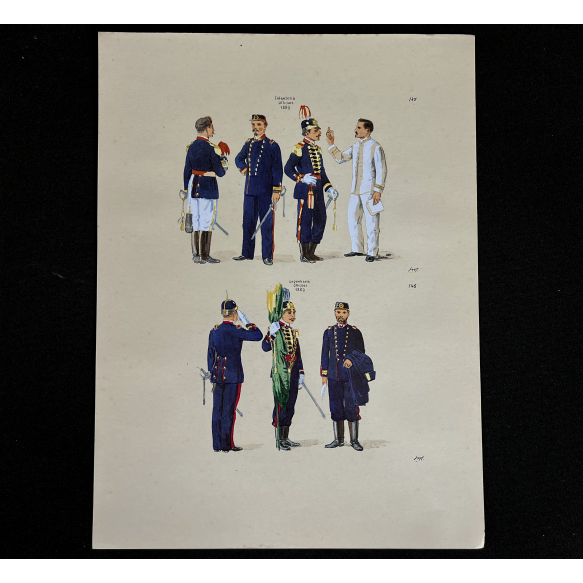 EspañolJOSÉ WASTH RODRIGUES (São Paulo, 1891 - Rio de Janeiro, 1957) 32x23 cm. Aquareladas à mão ESTAMPA N. 145 — INFANTARIA - 1889: Capitão, grande gala (calças facultativas) ; Tenente, pequena gala; Idem, grande gala; d) Idem. E STAMPA N. 146 - ENGENHARIA - 1889: Official, grande uniforme; Porta-Bandeira, idem; Capitão, pequeno uniforme. Impresso em Paris, ano 1922:A. FERROUD. - F. FERROUD, Succ. 127, Boulevard Saint German, 127. Um exaustivo e valoroso trabalho consagrado como um dos maiores clássicos relacionados ao tema. Raríssima obra da qual foram editadas apenas 500 unidades e aquareladas à mão. A Coleção Iconográfica Uniformes Militares compõe o Arquivo Histórico do Museu Histórico Nacional. O pintor José Wasth Rodrigues foi um grande historiador e estudioso da arquitetura colonial no Brasil. Seus estudos do início do século 20 foram incorporados ao livro “Documentário Arquitetônico”, no qual o autor se dedica à complexidade do patrimônio nacional. Publicado pela primeira vez em 1940, o estudo reúne uma série de elementos que podem ser vistos também nas obras do acervo do Museu do Ipiranga.