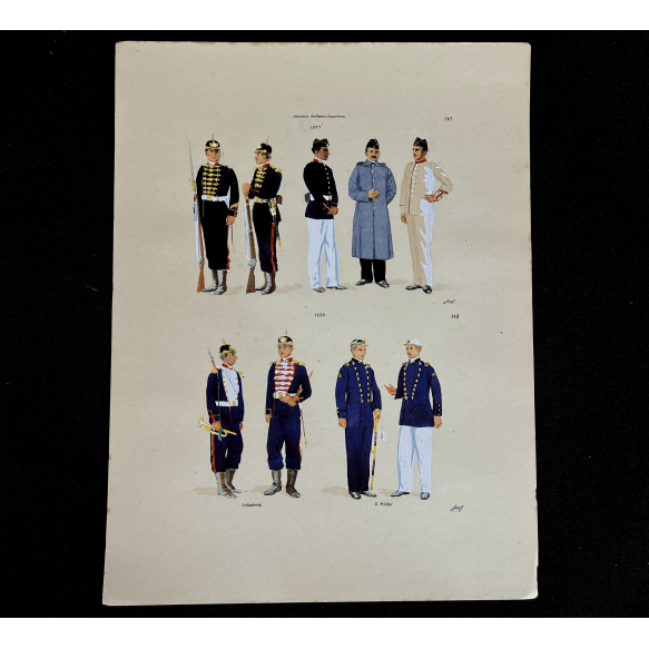 EspañolJOSÉ WASTH RODRIGUES (São Paulo, 1891 - Rio de Janeiro, 1957) 32x23 cm. Aquareladas à mão ESTAMPA N. 147 — INFANTARIA, ARTILHARIA E ENGENHARIA — 1889: Cabo de Infantaria em primeiro uniforme; Soldado de Artilharia, idem; Soldado de Infantaria, segundo unitorme; Soldado de Engenharia, idem; Anspessada de Infantaria, idem. ESTAMPA N. 148 — INFANTARIA E ESCOLA MILITAR - 1889: Corneta de Infantaria, primeiro uniforme; Musico da mesma arma, idem; Alumno da Escola Militar, idem; Alumno em segundo uniforme. Impresso em Paris, ano 1922:A. FERROUD. - F. FERROUD, Succ. 127, Boulevard Saint German, 127. Um exaustivo e valoroso trabalho consagrado como um dos maiores clássicos relacionados ao tema. Raríssima obra da qual foram editadas apenas 500 unidades e aquareladas à mão. A Coleção Iconográfica Uniformes Militares compõe o Arquivo Histórico do Museu Histórico Nacional. O pintor José Wasth Rodrigues foi um grande historiador e estudioso da arquitetura colonial no Brasil. Seus estudos do início do século 20 foram incorporados ao livro “Documentário Arquitetônico”, no qual o autor se dedica à complexidade do patrimônio nacional. Publicado pela primeira vez em 1940, o estudo reúne uma série de elementos que podem ser vistos também nas obras do acervo do Museu do Ipiranga.