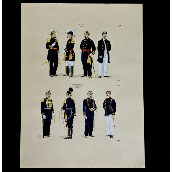 EspañolJOSÉ WASTH RODRIGUES (São Paulo, 1891 - Rio de Janeiro, 1957) 32x23 cm. Aquareladas à mão ESTAMPA N. 149 — ESTADO MAIOR GENERAL — 1890: Marechal, grande gala; General de Divisão, segundo uniforme; Idem, terceiro uniforme; Idem, quarto. ESTAMPA N. 150 —CORPOS ESPECIAES — 1890: Major do Estado Maior, grande gala, a pé; Idem a cavallo; Capitão do Estado Maior, segunda gala; Tenente Medico, idem. Impresso em Paris, ano 1922:A. FERROUD. - F. FERROUD, Succ. 127, Boulevard Saint German, 127. Um exaustivo e valoroso trabalho consagrado como um dos maiores clássicos relacionados ao tema. Raríssima obra da qual foram editadas apenas 500 unidades e aquareladas à mão. A Coleção Iconográfica Uniformes Militares compõe o Arquivo Histórico do Museu Histórico Nacional. O pintor José Wasth Rodrigues foi um grande historiador e estudioso da arquitetura colonial no Brasil. Seus estudos do início do século 20 foram incorporados ao livro “Documentário Arquitetônico”, no qual o autor se dedica à complexidade do patrimônio nacional. Publicado pela primeira vez em 1940, o estudo reúne uma série de elementos que podem ser vistos também nas obras do acervo do Museu do Ipiranga.