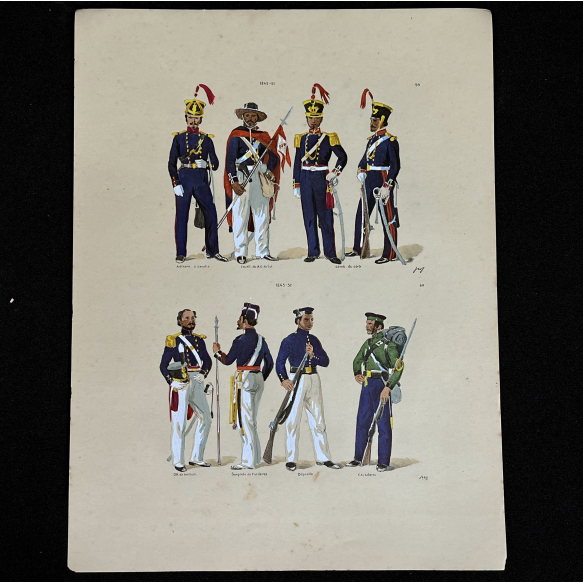 EspañolJOSÉ WASTH RODRIGUES (São Paulo, 1891 - Rio de Janeiro, 1957) 32x23 cm. Aquareladas à mão ESTAMPA N. 59 — 1845 a 1851: Soldado de Artilharia a Cavallo, primeiro uniforme; Praça do 2° Regimento de Cavallaria do Rio Grande do Sul, segundo uniforme; Capitão do 1° Regimento de Cavallaria, grande gala; Soldado do mesmo regimento, idem. ESTAMPA N. 60 — 1845 a 1851: Tenente de Artifices, primeiro uniforme; Sargento de Fusileiros, segundo uniforme; Soldado do Deposito de Recrutas, idem; Soldado de Caçadores, idem. Impresso em Paris, ano 1922:A. FERROUD. -F. FERROUD, Succ. 127, Boulevard Saint German, 127. Um exaustivo e valoroso trabalho consagrado como um dos maiores clássicos relacionados ao tema. Raríssima obra da qual foram editadas apenas 500 unidades e aquareladas à mão. A Coleção Iconográfica Uniformes Militares compõe o Arquivo Histórico do Museu Histórico Nacional. O pintor José Wasth Rodrigues foi um grande historiador e estudioso da arquitetura colonial no Brasil. Seus estudos do início do século 20 foram incorporados ao livro “Documentário Arquitetônico”, no qual o autor se dedica à complexidade do patrimônio nacional. Publicado pela primeira vez em 1940, o estudo reúne uma série de elementos que podem ser vistos também nas obras do acervo do Museu do Ipiranga.