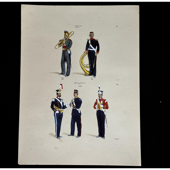 EspañolJOSÉ WASTH RODRIGUES (São Paulo, 1891 - Rio de Janeiro, 1957) 32x23 cm. Aquareladas à mão ESTAMPA N. 61 — ARTILHARIA A PÉ de 1845 a 1850: Musico do 2º Batalhão (1845); Musico do 4° Batalhão (1850). ESTAMPA N. 62 — 1850: Musico do 2º Batalhão de Fusileiros, grande gala; Musico do mesmo corpo, idem; Musico da banda de pancadaria do mesmo, idem. Impresso em Paris, ano 1922:A. FERROUD. -F. FERROUD, Succ. 127, Boulevard Saint German, 127. Um exaustivo e valoroso trabalho consagrado como um dos maiores clássicos relacionados ao tema. Raríssima obra da qual foram editadas apenas 500 unidades e aquareladas à mão. A Coleção Iconográfica Uniformes Militares compõe o Arquivo Histórico do Museu Histórico Nacional. O pintor José Wasth Rodrigues foi um grande historiador e estudioso da arquitetura colonial no Brasil. Seus estudos do início do século 20 foram incorporados ao livro “Documentário Arquitetônico”, no qual o autor se dedica à complexidade do patrimônio nacional. Publicado pela primeira vez em 1940, o estudo reúne uma série de elementos que podem ser vistos também nas obras do acervo do Museu do Ipiranga.