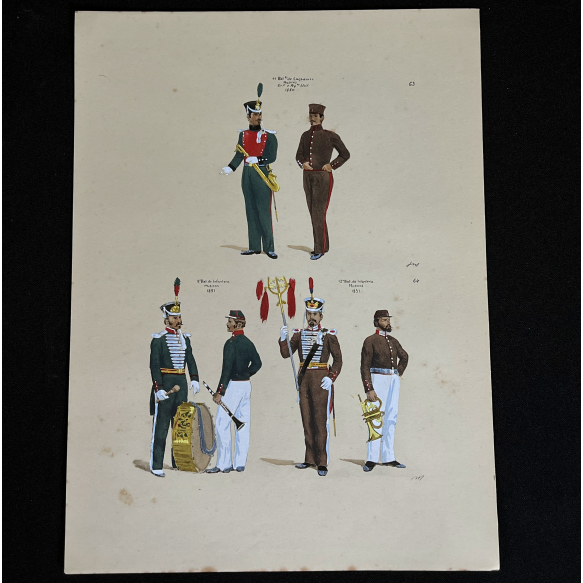EspañolJOSÉ WASTH RODRIGUES (São Paulo, 1891 - Rio de Janeiro, 1957) 32x23 cm. Aquareladas à mão ESTAMPA N. 63—1850: Musico do 11° Batalhão de Infantaria, primeiro uniforme; Musico do mesmo batalhão, segundo uniforme. ESTAMPA N. 64 — MUSICOS - 1851: Do 9° Batalhão de Infantaria, grande uniforme; Idem, pequeno uniforme; Do 12° Batalhão de Infantaria, grande uniforme; Idem, pequeno uniforme. Impresso em Paris, ano 1922:A. FERROUD. -F. FERROUD, Succ. 127, Boulevard Saint German, 127. Um exaustivo e valoroso trabalho consagrado como um dos maiores clássicos relacionados ao tema. Raríssima obra da qual foram editadas apenas 500 unidades e aquareladas à mão. A Coleção Iconográfica Uniformes Militares compõe o Arquivo Histórico do Museu Histórico Nacional. O pintor José Wasth Rodrigues foi um grande historiador e estudioso da arquitetura colonial no Brasil. Seus estudos do início do século 20 foram incorporados ao livro “Documentário Arquitetônico”, no qual o autor se dedica à complexidade do patrimônio nacional. Publicado pela primeira vez em 1940, o estudo reúne uma série de elementos que podem ser vistos também nas obras do acervo do Museu do Ipiranga.