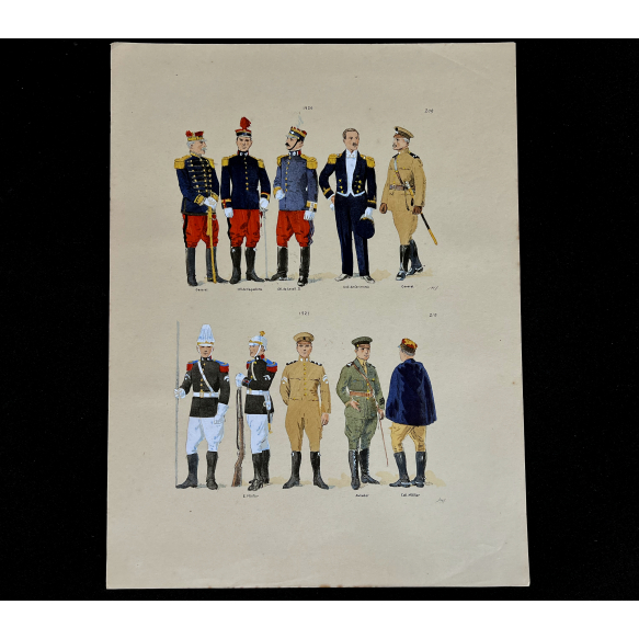 EspañolJOSÉ WASTH RODRIGUES (São Paulo, 1891 - Rio de Janeiro, 1957) 32x23 cm. Aquareladas à mão ESTAMPA N. 209 — 1920: General em primeiro uniforme (anteriormente segundo uniforme) ; Tenente de Caçadores em uniforme de formatura; Major de Cavallaria Divisionaria em grande gala; Capitão de Infantaria, farda de ceremonia; General de Brigada, fardamento de flanella kaki. ESTAMPA N. 210 — 1921: Alumno do 3° anno da mesma escola, de Cavalaria, grande uniforme: Alumno do 3° anno da mesma escola, de Infantaria, uniforme kaki; Sargento Aviador em farda de passeio; Alumno do Collegio Militar, uniforme kaki. Impresso em Paris, ano 1922: A. FERROUD. - F. FERROUD, Succ. 127, Boulevard Saint German, 127. Um exaustivo e valoroso trabalho consagrado como um dos maiores clássicos relacionados ao tema. Raríssima obra da qual foram editadas apenas 500 unidades e aquareladas à mão. A Coleção Iconográfica Uniformes Militares compõe o Arquivo Histórico do Museu Histórico Nacional. O pintor José Wasth Rodrigues foi um grande historiador e estudioso da arquitetura colonial no Brasil. Seus estudos do início do século 20 foram incorporados ao livro “Documentário Arquitetônico”, no qual o autor se dedica à complexidade do patrimônio nacional. Publicado pela primeira vez em 1940, o estudo reúne uma série de elementos que podem ser vistos também nas obras do acervo do Museu do Ipiranga.