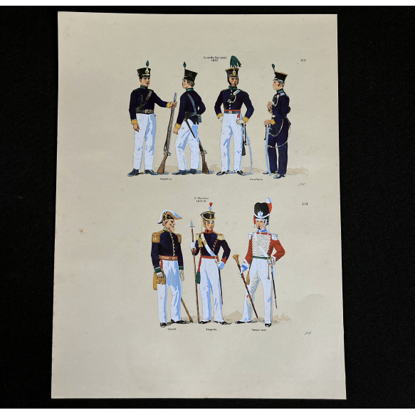 EspañolJOSÉ WASTH RODRIGUES (São Paulo, 1891 - Rio de Janeiro, 1957) 32x23 cm. Aquareladas à mão ESTAMPA N. 212 — 1832: Guarda de Infantaria; Idem; Tenente de Cavallaria; Guarda da mesma arma. ESTAMPA N. 213— 1840 a 1850: Coronel Commandante Superior em grande gala; Sargento de Infantaria, idem; Tambor Mór de Infantaria, idem. Impresso em Paris, ano 1922: A. FERROUD. - F. FERROUD, Succ. 127, Boulevard Saint German, 127. Um exaustivo e valoroso trabalho consagrado como um dos maiores clássicos relacionados ao tema. Raríssima obra da qual foram editadas apenas 500 unidades e aquareladas à mão. A Coleção Iconográfica Uniformes Militares compõe o Arquivo Histórico do Museu Histórico Nacional. O pintor José Wasth Rodrigues foi um grande historiador e estudioso da arquitetura colonial no Brasil. Seus estudos do início do século 20 foram incorporados ao livro “Documentário Arquitetônico”, no qual o autor se dedica à complexidade do patrimônio nacional. Publicado pela primeira vez em 1940, o estudo reúne uma série de elementos que podem ser vistos também nas obras do acervo do Museu do Ipiranga.