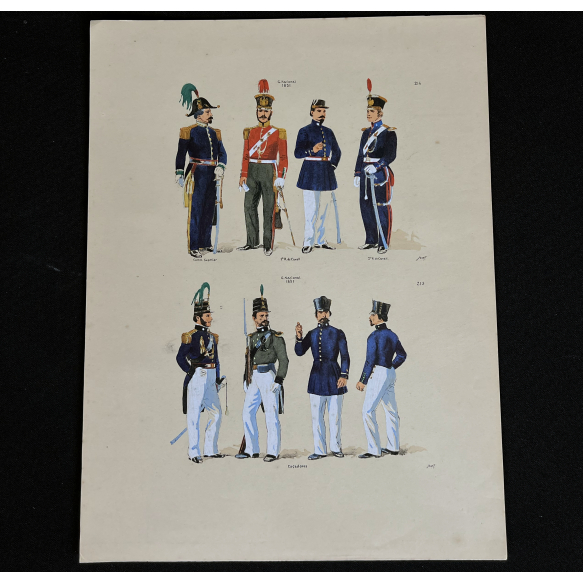 EspañolJOSÉ WASTH RODRIGUES (São Paulo, 1891 - Rio de Janeiro, 1957) 32x23 cm. Aquareladas à mão ESTAMPA N. 214 — 1851: Coronel Commandante Superior, grande gala; Coronel do 1° Regimento de Cavallaria, idem; Alferes do mesmo corpo, pequena gala; Guarda do 2° Regimento de Cavallaria, grande gala. ESTAMPA N. 215 — 1851: Capitão de Caçadores, grande uniforme; Guarda da mesma arma, idem; Alferes da mesma arma, pequeno uniforme; Guarda, idem. Impresso em Paris, ano 1922: A. FERROUD. - F. FERROUD, Succ. 127, Boulevard Saint German, 127. Um exaustivo e valoroso trabalho consagrado como um dos maiores clássicos relacionados ao tema. Raríssima obra da qual foram editadas apenas 500 unidades e aquareladas à mão. A Coleção Iconográfica Uniformes Militares compõe o Arquivo Histórico do Museu Histórico Nacional. O pintor José Wasth Rodrigues foi um grande historiador e estudioso da arquitetura colonial no Brasil. Seus estudos do início do século 20 foram incorporados ao livro “Documentário Arquitetônico”, no qual o autor se dedica à complexidade do patrimônio nacional. Publicado pela primeira vez em 1940, o estudo reúne uma série de elementos que podem ser vistos também nas obras do acervo do Museu do Ipiranga.