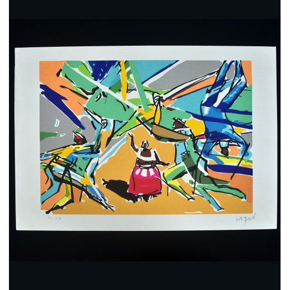 EspañolCARYBE SERIGRAFIA LIMITADA P.I.3/15. A PARTIR DA OBRA DE JORGE AMADO: "O COMPADRE DE OGUN", DO ÁLBUM: LITHOS EDIÇÕES. TIRAGEM LITHOS 1997. (CENA COM CAPOEIRAS) MED: 35 X 50
