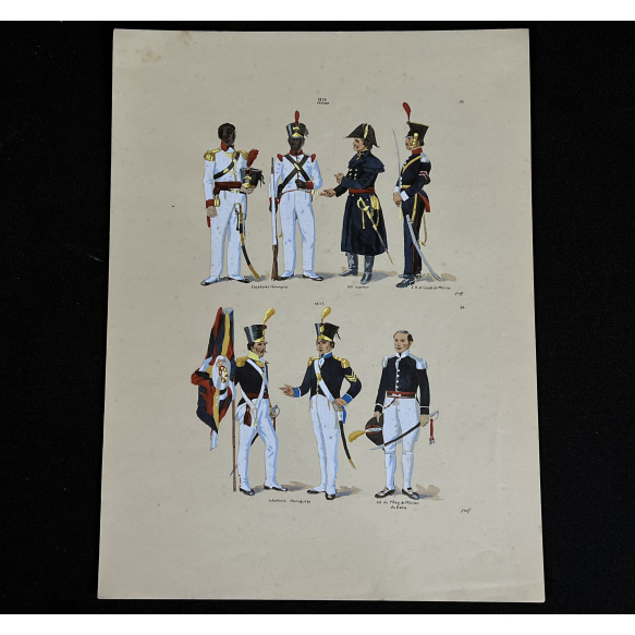 EspañolJOSÉ WASTH RODRIGUES (São Paulo, 1891 - Rio de Janeiro, 1957) 32x23 cm. Aquareladas à mão ESTAMPA N. 35— Milicias, 1816: Coronel do Regimento de Caçadores Henriques em grande uniforme; Soldado do mesmo regimento; Official Superior de Milicias em pequeno uniforme; Cabo do 2° Regimento de Cavallaria de Milicias em grande uniforme. ESTAMPA N. 36 — Brasil, 1815: Alferes Porta-Bandeira da Infantaria Portugueza no Brasil; Official inferior da mesma; Official superior do 1° Regimento de Milicias da Bahia. Impresso em Paris, ano 1922:A. FERROUD. -F. FERROUD, Succ. 127, Boulevard Saint German, 127. Um exaustivo e valoroso trabalho consagrado como um dos maiores clássicos relacionados ao tema. Raríssima obra da qual foram editadas apenas 500 unidades e aquareladas à mão. A Coleção Iconográfica Uniformes Militares compõe o Arquivo Histórico do Museu Histórico Nacional. O pintor José Wasth Rodrigues foi um grande historiador e estudioso da arquitetura colonial no Brasil. Seus estudos do início do século 20 foram incorporados ao livro “Documentário Arquitetônico”, no qual o autor se dedica à complexidade do patrimônio nacional. Publicado pela primeira vez em 1940, o estudo reúne uma série de elementos que podem ser vistos também nas obras do acervo do Museu do Ipiranga.