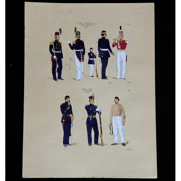 EspañolJOSÉ WASTH RODRIGUES (São Paulo, 1891 - Rio de Janeiro, 1957) 32x23 cm. Aquareladas à mão ESTAMPA N. 87 — ARTILHARIA A PE -1856: a) Capitão do 1º Batalhão em grande gala; b) Alferes do 2°, idem; c) Praça de pret do 1°, segundo uniforme; d) Musico do mesmo, idem; e). Musico do mesmo em grande gala. ESTAMPA N. 88 — DEPOSITO DA CORTE - 1856: a) Alferes em pequeno uniforme; b) Soldado em grande uniforme; c) Soldado em pequeno uniforme. Impresso em Paris, ano 1922:A. FERROUD. - F. FERROUD, Succ. 127, Boulevard Saint German, 127. Um exaustivo e valoroso trabalho consagrado como um dos maiores clássicos relacionados ao tema. Raríssima obra da qual foram editadas apenas 500 unidades e aquareladas à mão. A Coleção Iconográfica Uniformes Militares compõe o Arquivo Histórico do Museu Histórico Nacional. O pintor José Wasth Rodrigues foi um grande historiador e estudioso da arquitetura colonial no Brasil. Seus estudos do início do século 20 foram incorporados ao livro “Documentário Arquitetônico”, no qual o autor se dedica à complexidade do patrimônio nacional. Publicado pela primeira vez em 1940, o estudo reúne uma série de elementos que podem ser vistos também nas obras do acervo do Museu do Ipiranga.